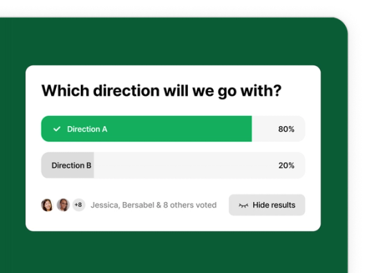 슬라이드에 생동감을 불어넣고 청중의 관심을 사로잡으세요! 실시간 여론조사, 투표, 정렬 척도를 사용하여 피드백을 수집하고 모든 응답을 자동으로 기록할 수 있습니다. 즉, 발표자가 사후에 다른 채널을 통해 피드백을 검토할 필요가 없으며, 회의에 불참한 사람들도 생생한 피드백을 참고할 수 있습니다.