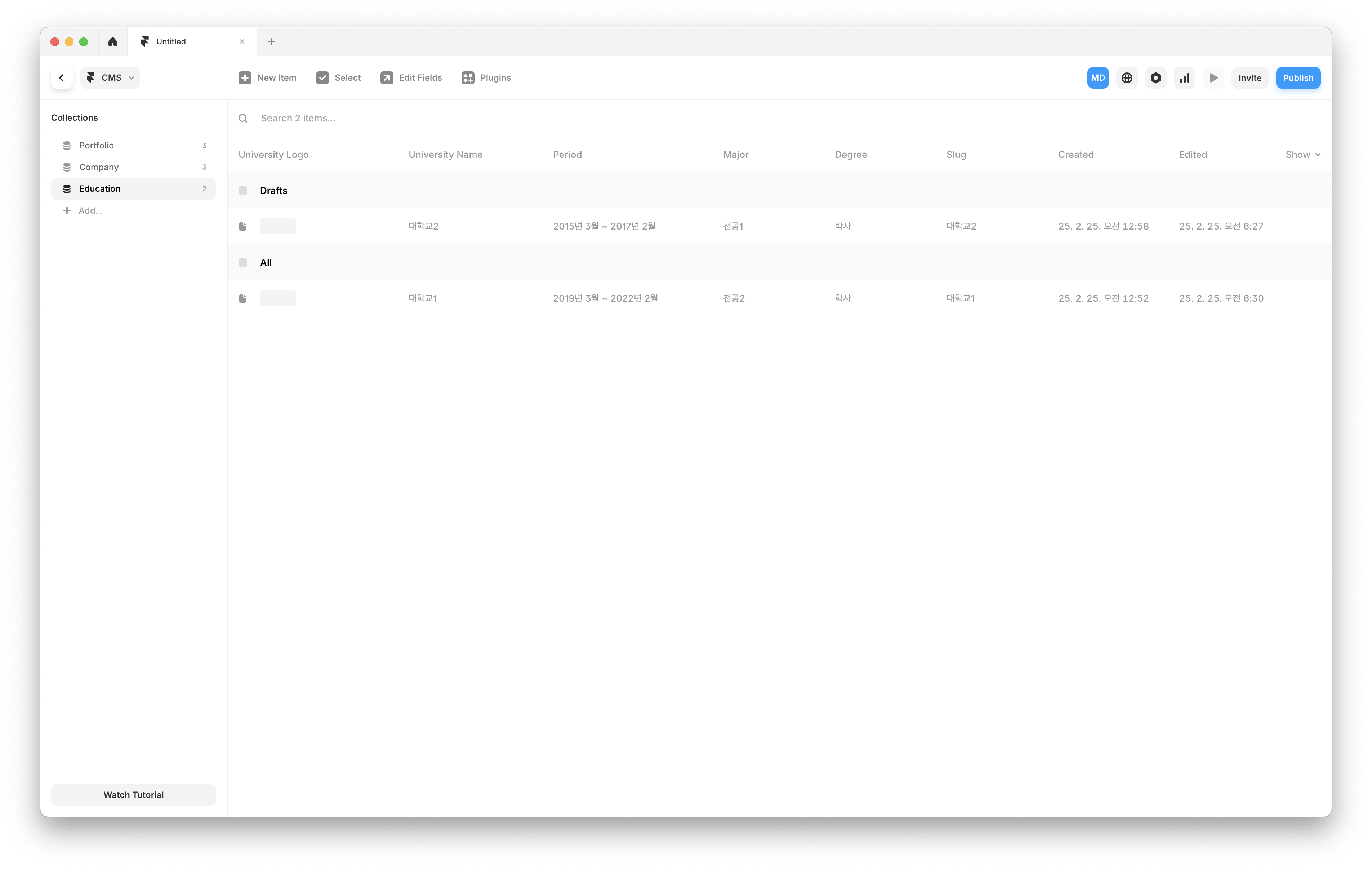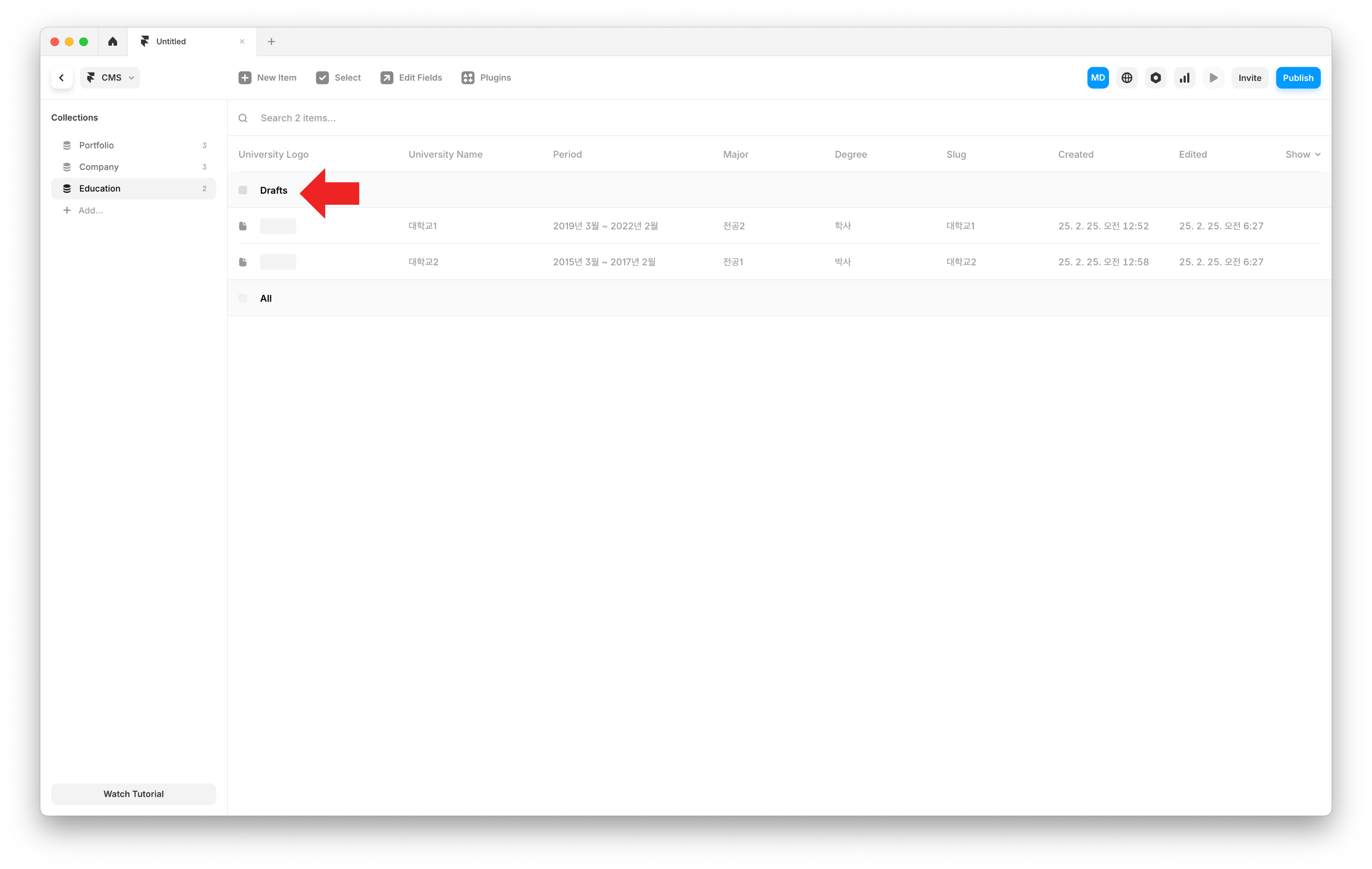 CMS Collection Draft CMS 왼쪽 Collections 패널에서 문제가 발생한 Collection의 Item이 Draft 상태인지 확인합니다.