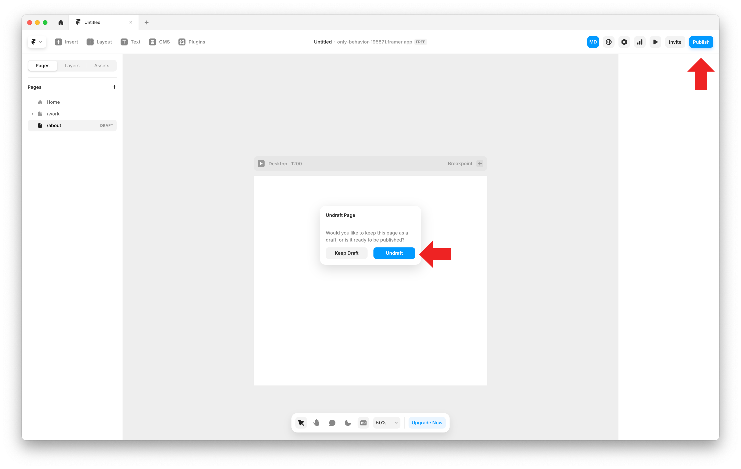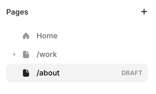 Framer의 왼쪽 패널에서 문제가 발생한 페이지가 Draft 상태인지 확인합니다.